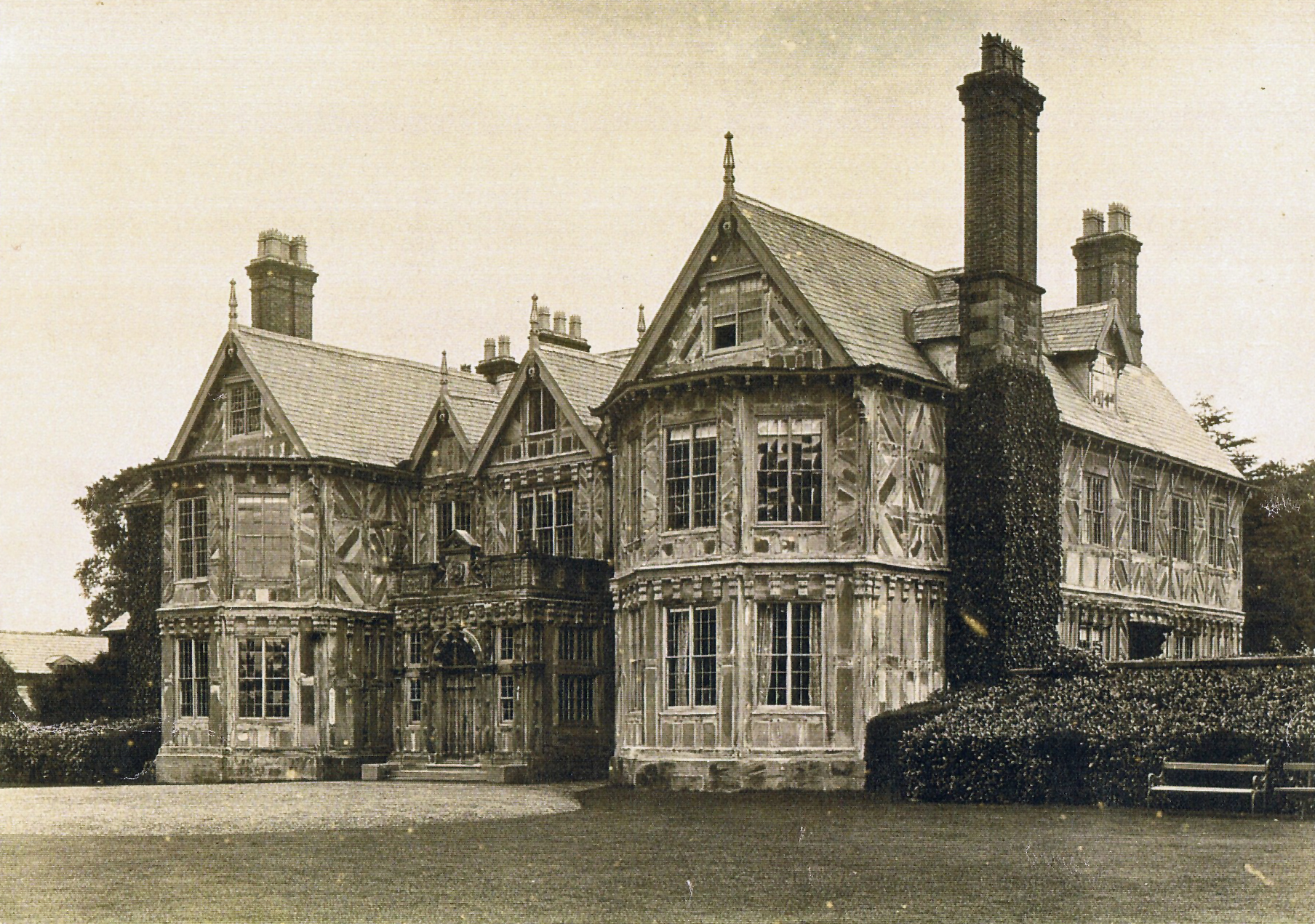 Broughton Hall was built in Threapwood for Randall Broughton in about 1642 when it replaced an earlier house. It is rectangular with two of its sides terminating in four gables with added bays in the front elevation at ground and first floor levels. The oldest part constructed of oaken beams, the interstices filled in with brick work covered with plaster. The beams were never painted, nor the plaster whitewashed however the timbers were oiled every 100 years. The tops of the two stories were ornamented externally with lines of carved corbels. The porch although in strict character with the older portion was not added till 1852. A red brick addition was added to the half timber house at the beginning of the 19th century.