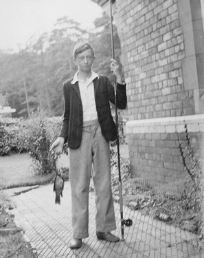 Perhaps my greatest pleasure as a child came from fishing. In the fields around Threapwood there were many ponds in which one could find several varieties of fish from lowly sticklebacks to roach, dace and the occasional tench. I think there is nothing so absorbing as watching a float bobbing up and down and then slowly sliding below the surface. My friend John Lampitt was better at the game than I was as he seemed to have an inborn instinct knowing when to 'strike'. The local farmers didn't seem to mind our trespassing on their land and we were careful to shut field gates after us. That's me on the right aged 16.