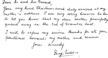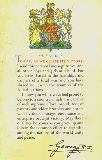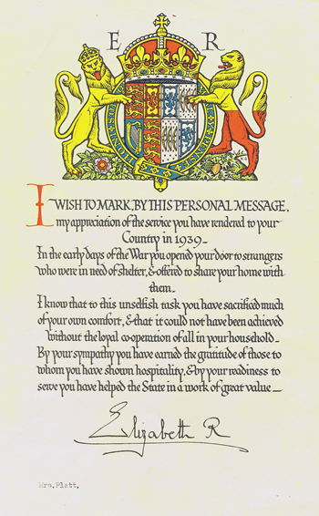 At the end of the war most evacuees were able to return home and life for them and their war time hosts resumed as normal. The contribution of those who had opened up their homes was marked by a letter sent out in the name of Queen Elizabeth (wife of King George VI) which thanked those involved. A letter was also sent to returning evacuees from King George VI in which he marked the end of what for many would have been a traumatic experience. The letters received after the war by Mrs Platt and Vera Hannaway herself are shown below.