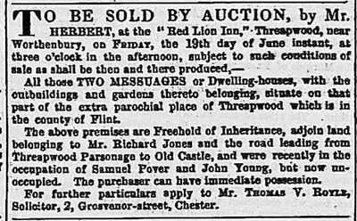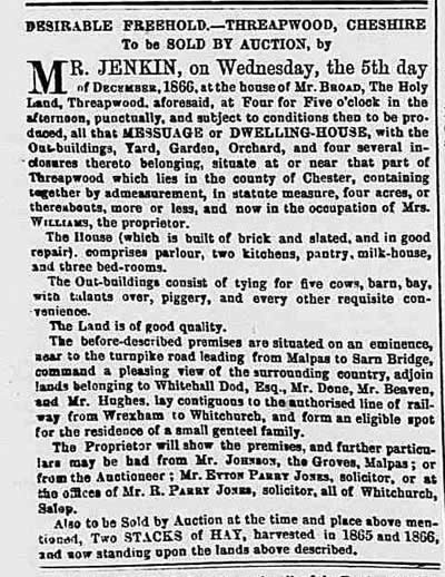 Sales by Messrs. Churton ON THURSDAY NEXT, & c. Sale at THREAPWOOD PARSONAGE HOUSE, Three miles from Malpas, nine from Wrexham, Ellesmere and Whitchurch, and near to Worthenbury in the County of Flint. MESSRS.CHURTON have received positive instructions from the Rev, Maxwell Phayre, (who is leaving the neighbourhood) to SELL by AUCTION, without the slightest reserve, on Thursday, Friday and Saturday, the 16th. 17th and 18th. days of November at Eleven for Twelve o’clock to the minute, the whole of the very excellent and modern HOUSEHOLD FURNITURE. There then follows a long list of items. Catalogues may be had one week prior to the sale, at the Lion Inn, Malpas; Emral Arms, Worthenbury; or at the Auctioneers’ Offices, Chester, or Whitchurch, Salop. (if by post on receipt of four stamps) N.B. A Piece of LAND, called the “ CHAPEL FIELD “ , adjoining Threapwood Parsonage House, will shortly be offered by Auction, of which due notice will be given.