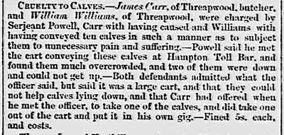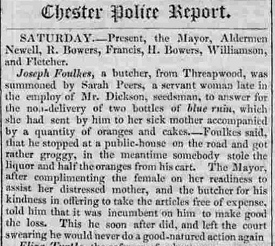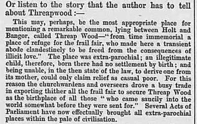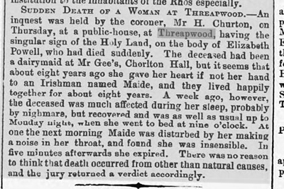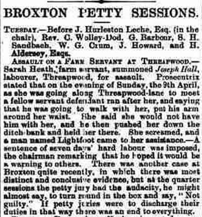 All life in the village, both happy and sad, has been recorded in our local newspapers. The various court cases reported below give substance to Threapwood's reputation in times past as a place of lawlessness and easy virtue. The various property sale advertisements highlight the names of former Public Houses in Threapwood now all converted to private houses.