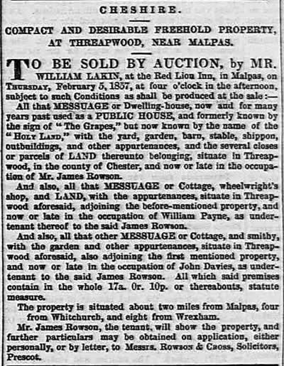 Sale by Auction Cheshire. Compact and desirable freehold PROPERTY at Threapwood, near Malpas BY MR.WILLIAM LAKIN On Thursday, the 5th day of February next, at Four o’clock in the afternoon, at the Red Lion, in Malpas, subject to such conditions such as shall be produced at the sale. ALL THE MESSUAGE or DWELLING HOUSE, now and for many years used as a Public House and formerly known by the sign of “The Grapes” but now known by the name of “The HOLY LAND”. Mr James Rowson, the tenant, will show the property, and further particulars may be obtained on application, either personally or by letter, to Messrs Rowson and Cross, solicitors, Prescot.