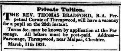 Advert: Education Cheshire. A married Clergyman, Graduate of Cambridge, residing on his Benefice, which is healthily situated three miles from Malpas, and who receives six Young Gentlemen from seven to twelve years of age, has now vacancies for two. Their manners and comforts are anxiously attended to, and their Education will be sound, comprising all the usual branches. Terms: including washing and all extras, 45 Guineas per annum. Address (post paid) the Rev. J.F.CHURTON, LL.B., Threapwood Parsonage, by Wrexham