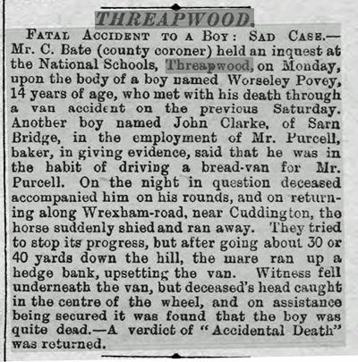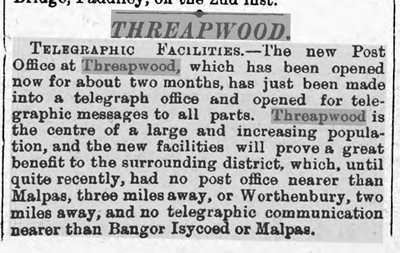 As with all small rural villages Threapwood has rarely hit the national headlines but has had its fair share of coverage in the local press. The following eclectic set of clippings are taken from various issues of local newspapers and give some flavour of life and commerce in Threapwood in times past.