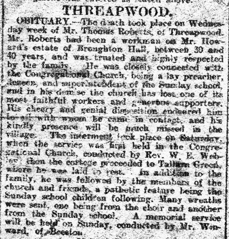 The parents of these six siblings were Thomas and Jane Roberts. Thomas married Jane Williams in 1873 at Hanmer Church. Jane was born at Rhostyllen near Wrexham and her mother was Welsh-speaking. Jane had moved to the Worthenbury area as a young woman to work at the Holyland Inn. Thomas and Jane’s children were born in Worthenbury but sometime after 1891 they moved to Threapwood. Thomas was employed by the Howard family of Broughton Hall for up to forty years. He lived on a farm called Llandeg, whilst at Worthenbury, probably owned by the Howards, but it is thought that his work was mostly with their horses. He was highly respected and valued by the Howard family and much esteemed locally. Thomas was a Lay Preacher and Deacon and Superintendent of the Sunday School at the Congregational Chapel in Threapwood. He died in 1915 and was buried at Tallarn Green Methodist Chapel alongside his wife who had died of cancer four years earlier (see press obituary).