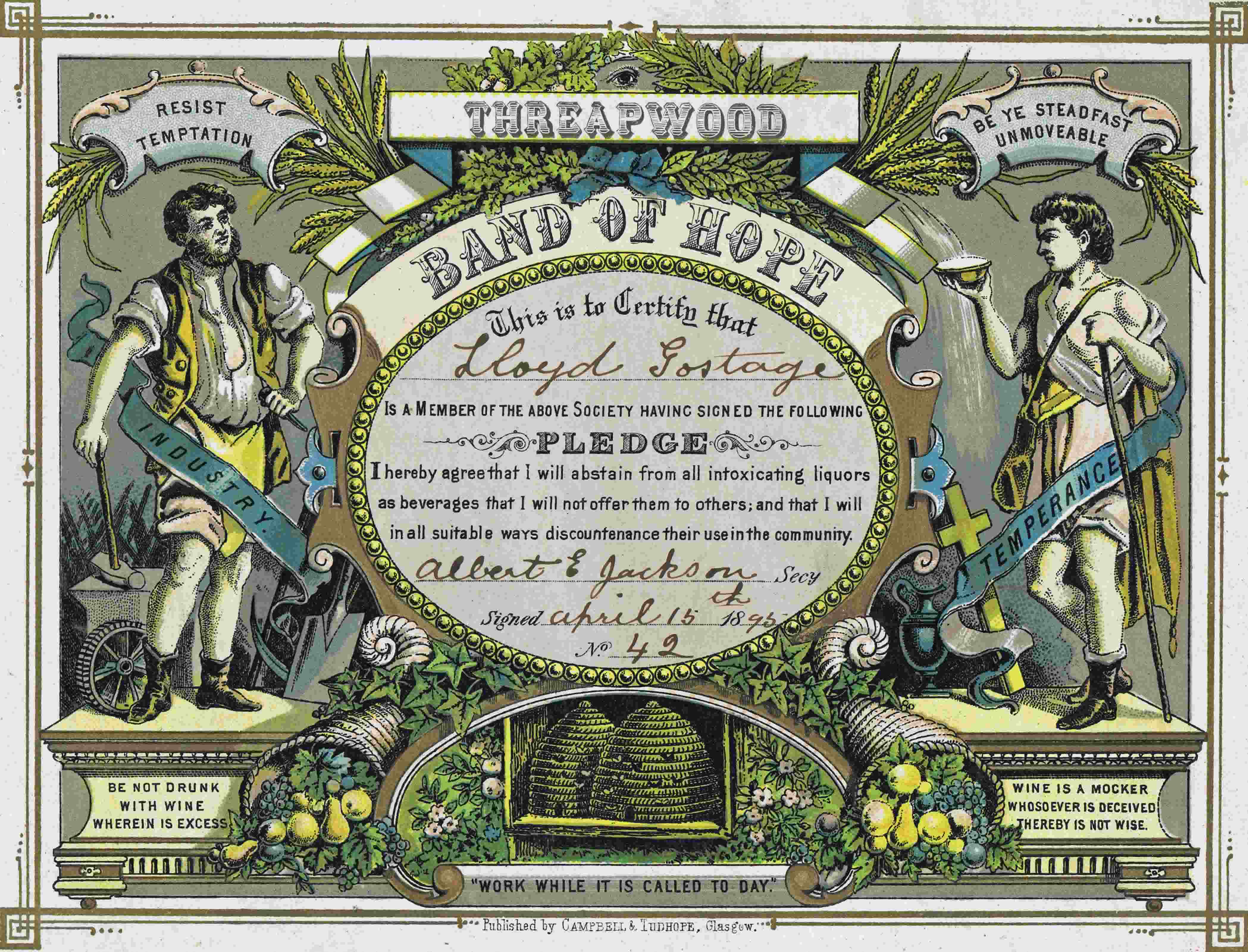 The family tree contained in the "Gostage Family History" referred to above shows that both Lucy's father and grandfather were both called Lloyd. The Certificate pictured below, dating to 1895, almost certainly belonged to Lloyd the elder, Lucy's grandfather, and certifies his enrolment in the "Band of Hope" temperance movement. Established in the mid 19th Century the Band of Hope aimed to teach children the importance and principles of sobriety and teetotalism. In 1855, a national organisation was formed amidst an explosion of Band of Hope work. Meetings were held in churches throughout the UK and included Christian teaching.