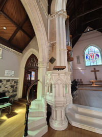 | Gravestone in cemetery | Plaque on Pulpit | Pulpit at St Paul's |