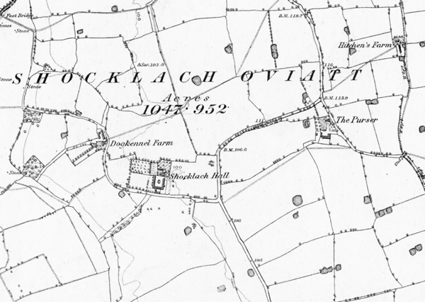 From 1871 to 1958 the Piggott family were tenants of Shocklach Hall (SH) which was the biggest farm on the Broughton Hall Estate (BH) – 263 acres. In the 1871 census George Piggott (GP) was recorded as farming SH with his wife Mary (nee Hassall) and 7 children who were Mary, Massie, Joseph, John, Edward, Elizabeth and Hugh. GP died in 1874 and at the time Joseph (JP) was farming at Wood Farm, Threapwood.