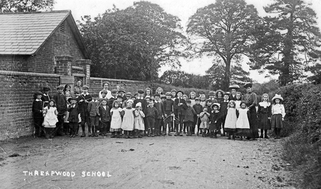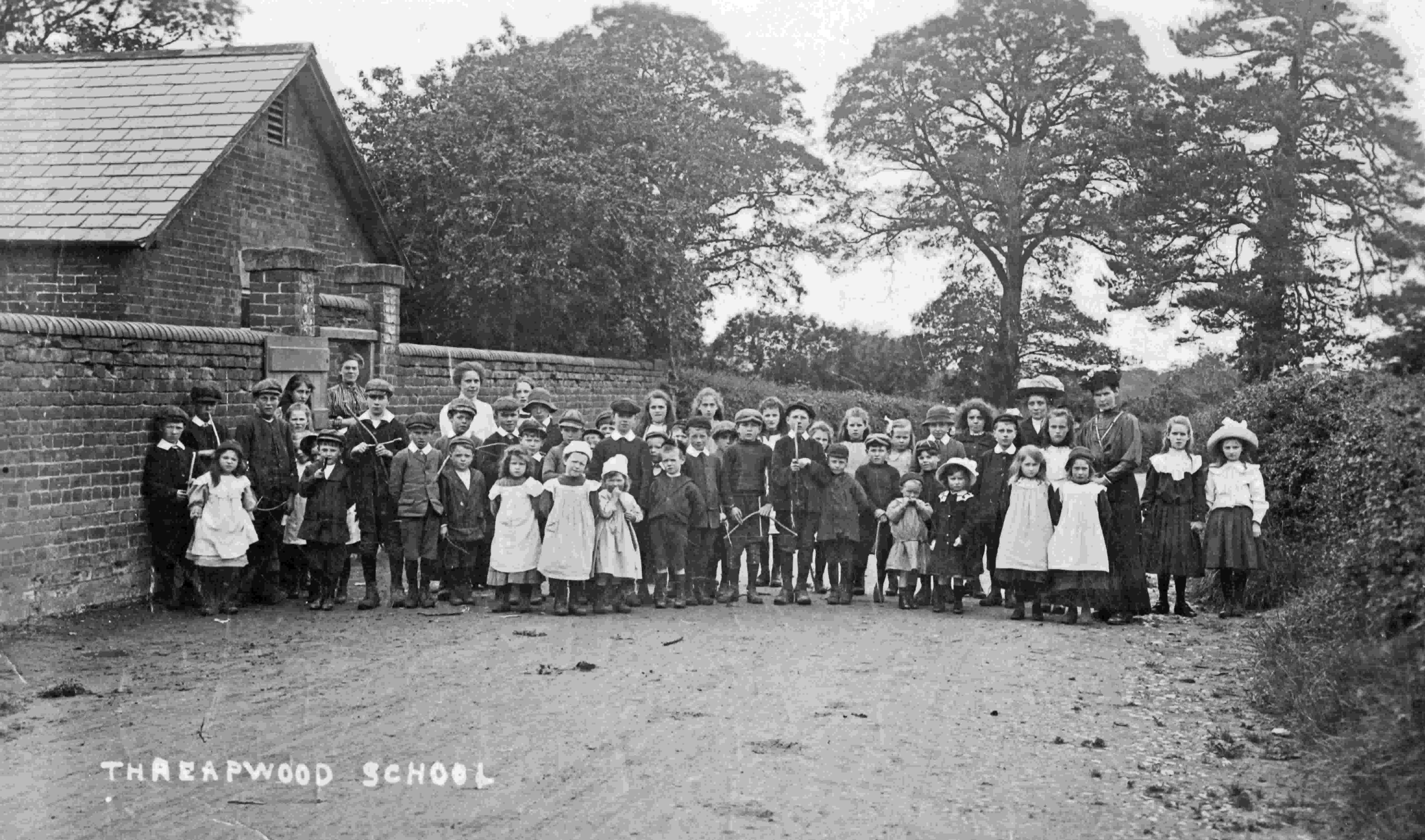 The photograph of Threapwood School pupils taken on the lane at the side of the school was probably 1910 or 11.They look ready for an outing but where to? The boys are wearing their caps and many have bows and arrows. Perhaps they are going to Broughton Hall for tea and games as they sometimes did. I am able to recognise the three Roberts children on the photo. When allowed out, the pupils played on this lane.