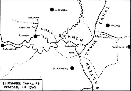 Following the Duke of Bridgewater's success in 1761 in constructing a canal to speed delivery of coal from his mines at Worsley to Manchester, the British canal network grew rapidly. By the 1790's 'canal mania' had gripped the country. Many proposals were fanciful and a lot of canal companies never made any money for their investors. However the Ellesmere Canal company, which developed a network of canals radiating from Ellesmere, was successful for a number of years. The company aimed to link the rivers Severn and Mersey and to profit from the transportation of coal, stone and agricultural products which were difficult to move over land.