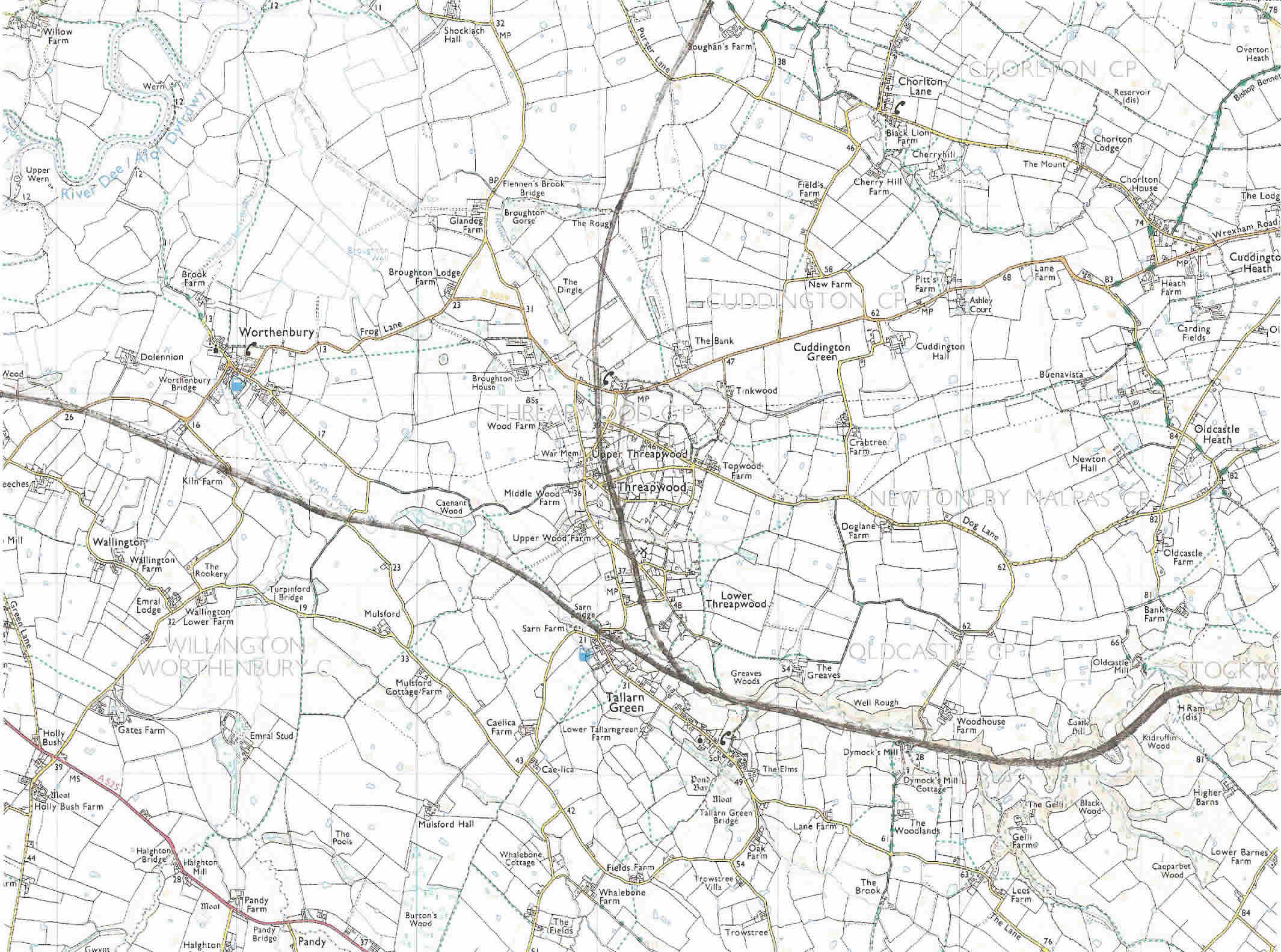 In 1862 the WMCQR sought approval for a line to connect Wrexham to Whitchurch (from where there was already a line to the developing railway hub at Crewe). The route of this line followed the Wych Brook from Worthenbury, south of Threapwood and across to Grindley Brook. Two years later the company applied to parliament for approval for a further extension from the route of this line to Farndon. The company's plans show that the route would have left the Wrexham/Whitchurch line near Greaves Wood and swung through Threapwood before heading north to Farndon. The Company's engineers (Mr R Piercy and Mr B Piercy) drew up detailed plans (in Chester Records Office) showing who were the owners, tenants and occupiers of each field the route would cross. Despite the efforts made to plan these routes and to secure Parliamentary approval (given on 25 July 1864 and 29 June 1865 respectively), neither extension to the railway was ever constructed. Had they been built, it is likely that a station would have been established in Threapwood to allow for passengers and freight changing from one line to the other.