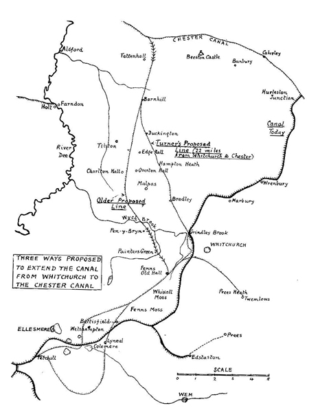 In order to understand this proposal it is necessary to look at a wider map of the Ellesmere Canal network and to remember the ultimate objective of linking the Severn and the Mersey. With the link from Chester to Ellesmere Port in place, the goal was to complete a link from Shrewsbury to Chester. A number of competing routes were suggested, of which the above was one of a number of Eastern routes which were favoured over the original plan for the canal to follow the western side of the Dee Valley from Ruabon to Wrexham, Pulford and Chester. The Eastern routes made use of the Nantwich to Chester canal which was completed in 1779. The Ellesmere Canal company built a canal from Ruabon to Welshfrankton (passing over aquaducts at Chirk and Pontcysylte completed in 1805) and by the same date the line from Welshfrankton via Grindley Brook to Hurleston (on the Chester Canal) was complete.