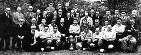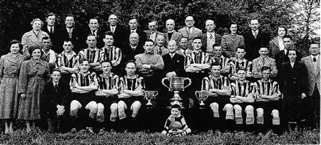 This is Sarn Rovers 1955 - 1956 proudly displaying the three trophies they secured that season. |