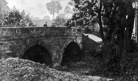 In 1896 the Flintshire part of the parish was transferred to Cheshire. Of the two bridges mentioned earlier, built and maintained by the inhabitants of Worthenbury, the stone and timber bridge over Paradise Stream (by the church) has long since been replaced by a brick culvert with the road raised on an embankment over it. The Sam Bridge was built in 1627 and it is interesting to note that under the two oldest arches the blocks of stone in each course are numbered, indicating that the masons John and David Smith dressed the stone to size, probably at the quarry, before bringing it to the site for erection. In 1819 another pair of arches was built to more than double the width of the bridge.