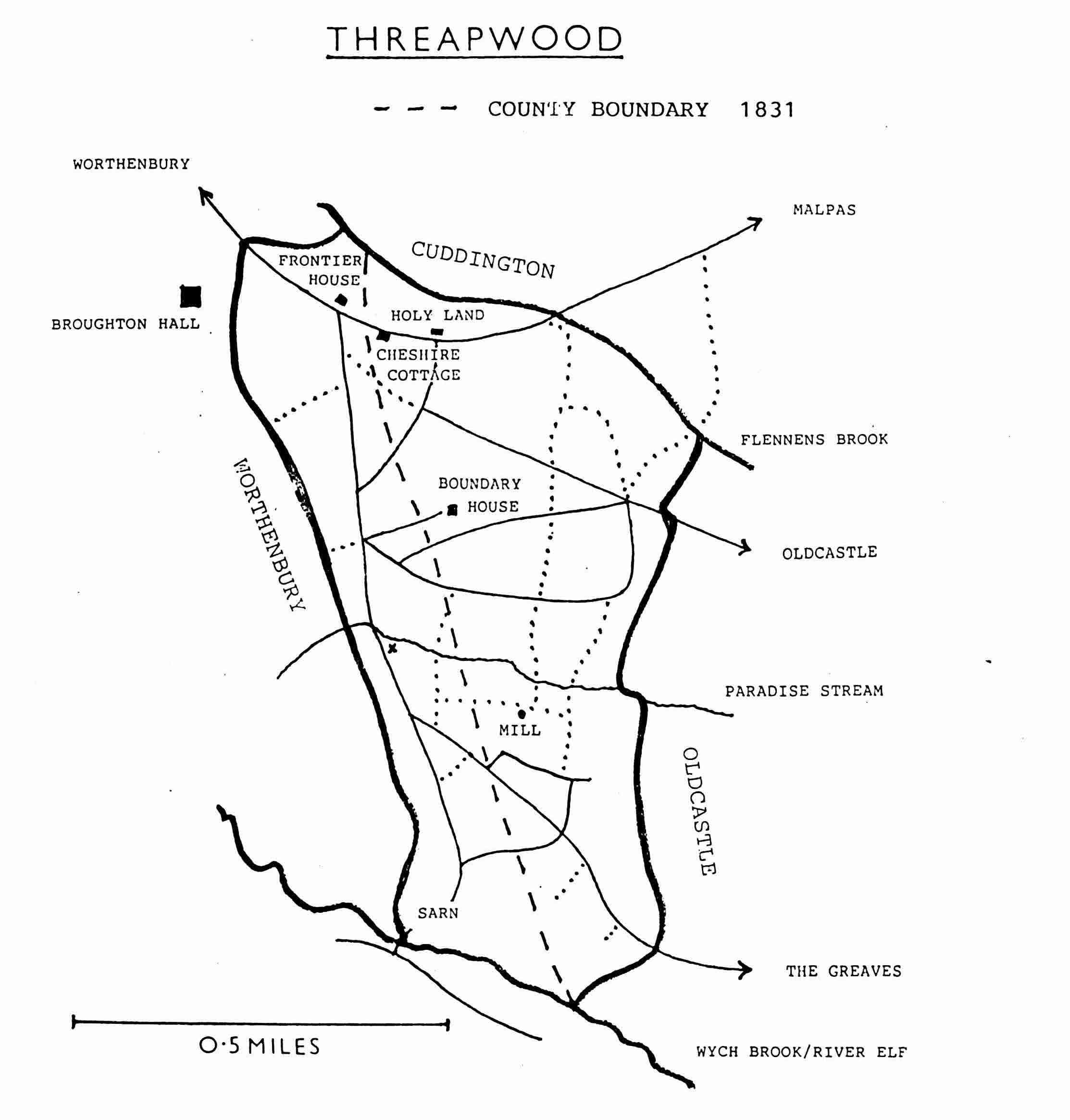 Archdeacon Thomas wrote that "Threapwood is an ecclesiastical district, partly in Flintshire and part in Cheshire, and was formed out of the old Domesday forest of Broughton, portions of which have been annexed to the parishes of Malpas and Worthenbury, comprising an area of about 240 acres as belonging to no parish".