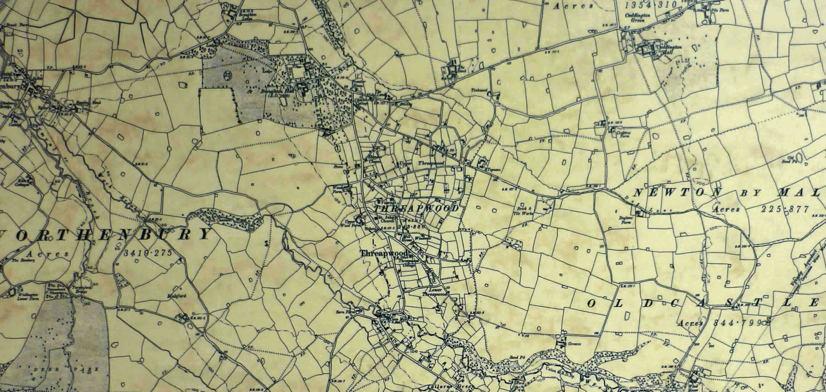 The name Threapwood means 'disputed wood' although another explanation is that it derives from the Saxon word 'Threp' meaning a ford, referring to a ford on the road crossing the Wych Brook (formerly called the River Elf) at the Sarn. Sarn means a road or a causeway, which probably crossed the brook a little higher upstream than the present bridges. The road itself may well be of Roman origin and what might be another slight deviation can be seen in the field opposite to the entrance to the old vicarage.