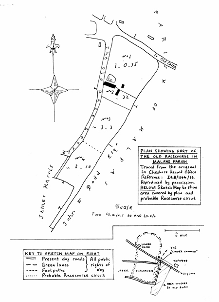 Further investigations revealed that at this time horse racing probably took place on the "Old Racecourse" on the patch of ground known today as the "Cinder Common" in Threapwood lying between Lower House and Topwood. Here there is a curious green lane (now a public footpath) which runs in a rough semi-circle and which, together with the road, encloses Lower House. This is the first mention of Bull and Bear Baiting in the neighbourhood, while the value of the prizes (plate worth £50) and prizes of 25 guineas on some occasions, seems to indicate that racing was well established.
