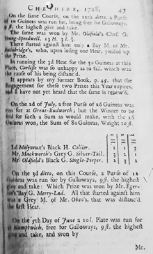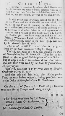 "They ran for a purse,value 25 guineas, each starter paid £2.2.0. and they were started by a trumpeter who had a fee of five shillings."