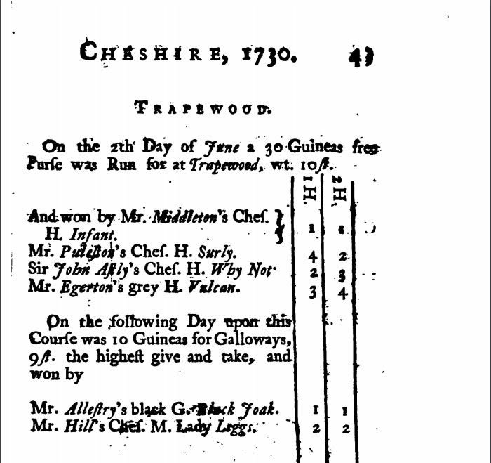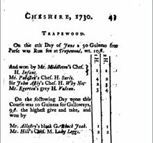 Further evidence of horse racing at Threapwood can be seen in Cheny’s Kalendar of 1728 and 1729. Images are reproduced below of various references to racing at Threapwood in the years 1728 and 1730.