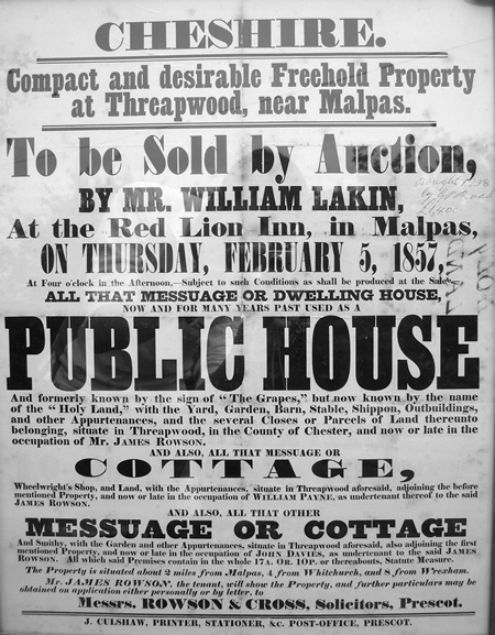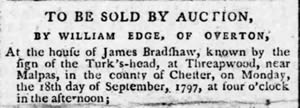 This for sale notice (right) dated to 1857 confirms that James Rowson was still in occupancy of the Holyland as a Public House in 1857. The notice also confirms the former name of the Holyland as being "The Grapes" public House. Photo courtesy of Tom Langley. Newspaper advertisements over the years have confirmed the existance of other Threapwood "pubs" such as this sale notice below for a pub known as "The Turks Head" from the Chester Courant of 29th August 1797. The precise location of the "Turks Head" is unknown. |