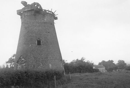 A well known landmark in Threapwood is the Grade II listed windmill pictured right. It is a brick, bottle shaped tower mill dating from the early eighteenth century. The three storey structure with door openings and arched windows had a tapering wooden dome. Parts of the sail platform and wheel mechanism are in situ but much of the structure has fallen in and is in a bad state of repair. The mill was still in use in the 1880's and would have been used to mill corn for animal feed as were the mills along the Wych Brook. The original Miller's cottage stands close by but is also in a derelict state. Click here for more