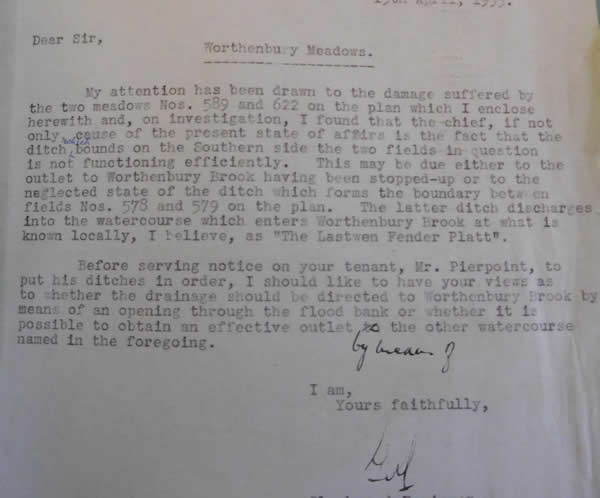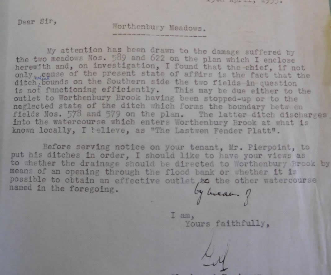 An interesting letter, dated 13 April 1935 from Gerald Wright (Clerk and Engineer for River Dee, Middle Level Drainage Board) to John Howard of Broughton Hall, relating to unmaintained ditches. |