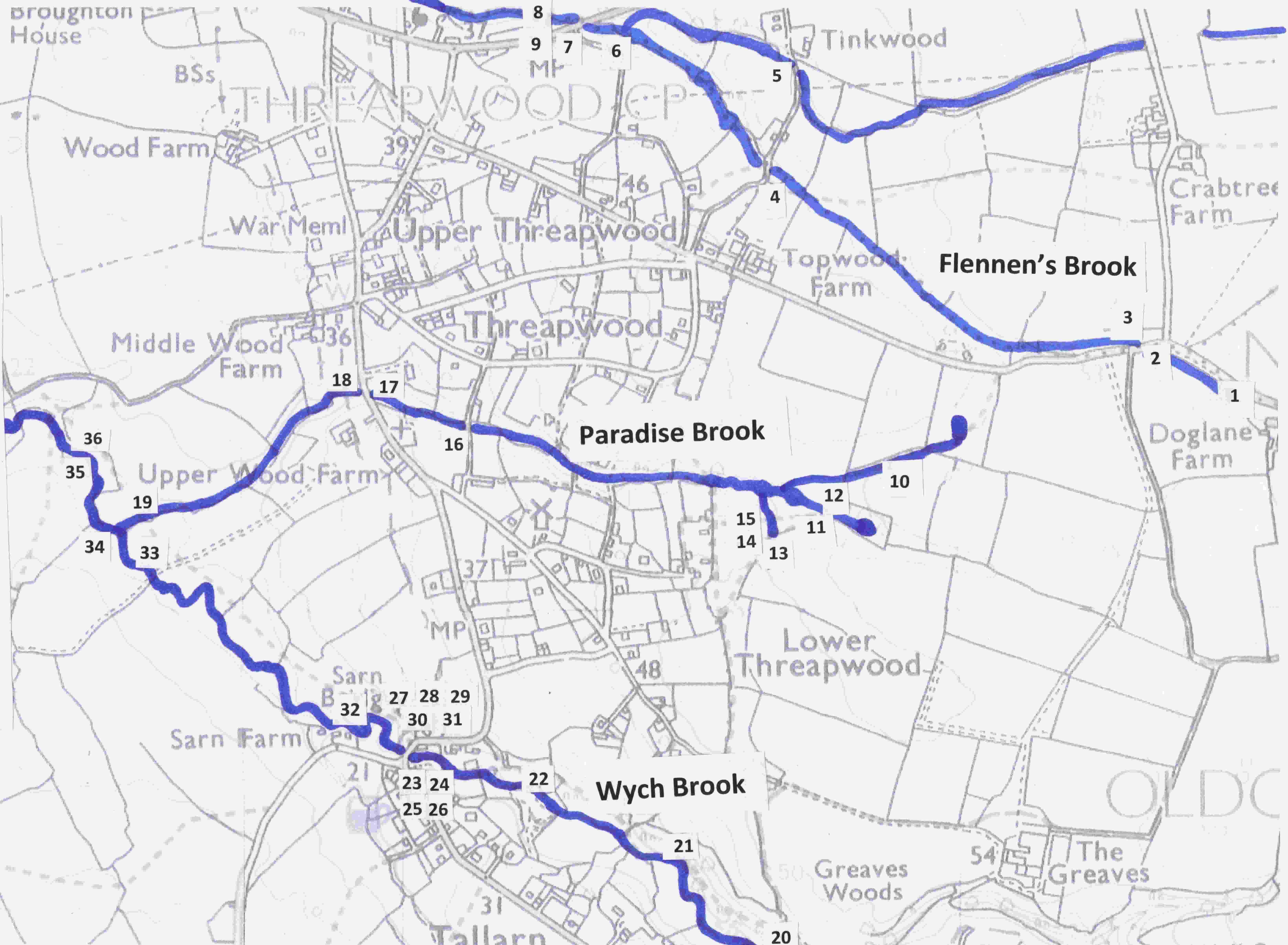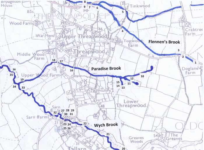 Threapwood’s watercourses are known as Flennen’s Brook, Paradise Brook and Wych Brook.