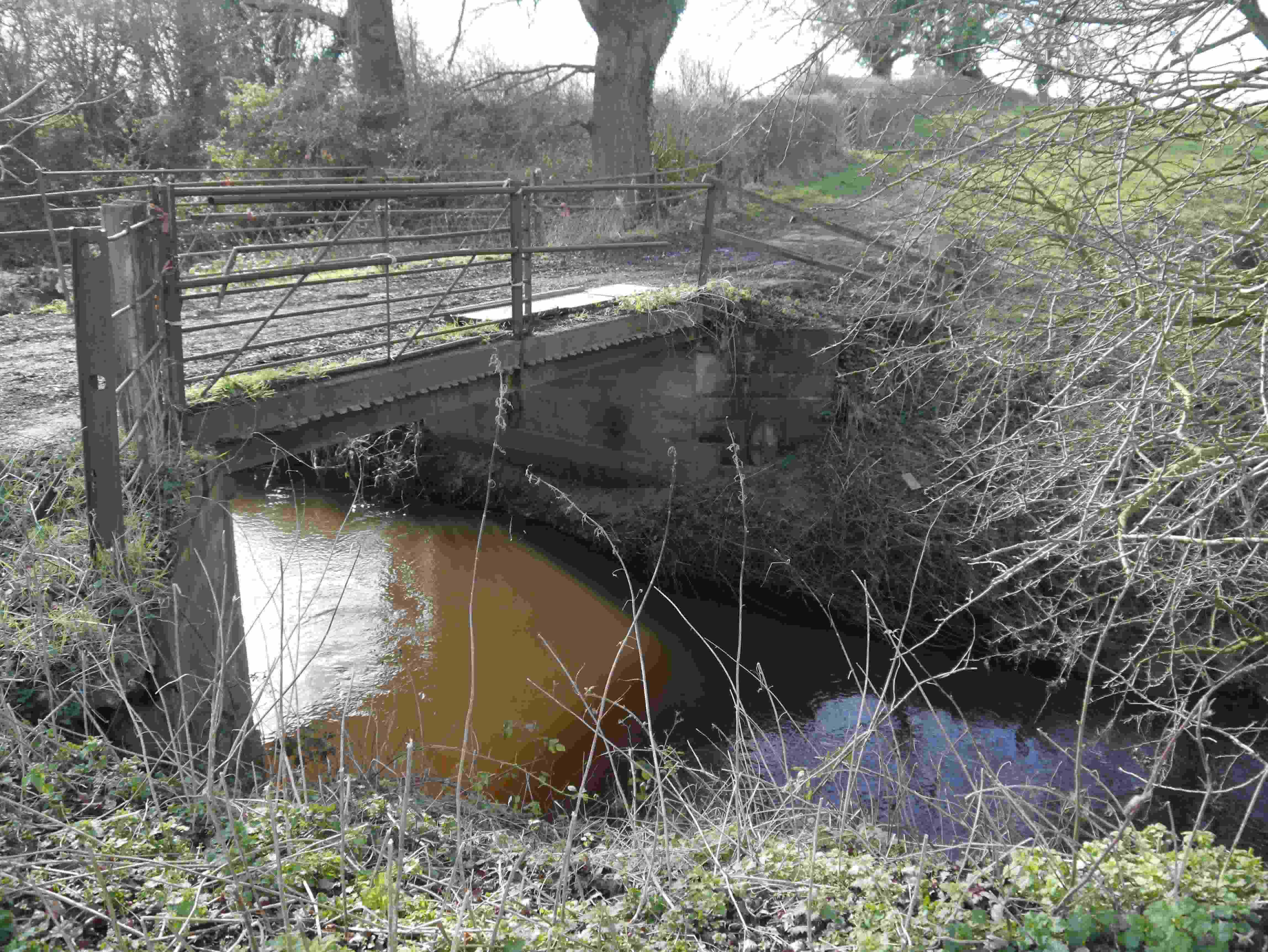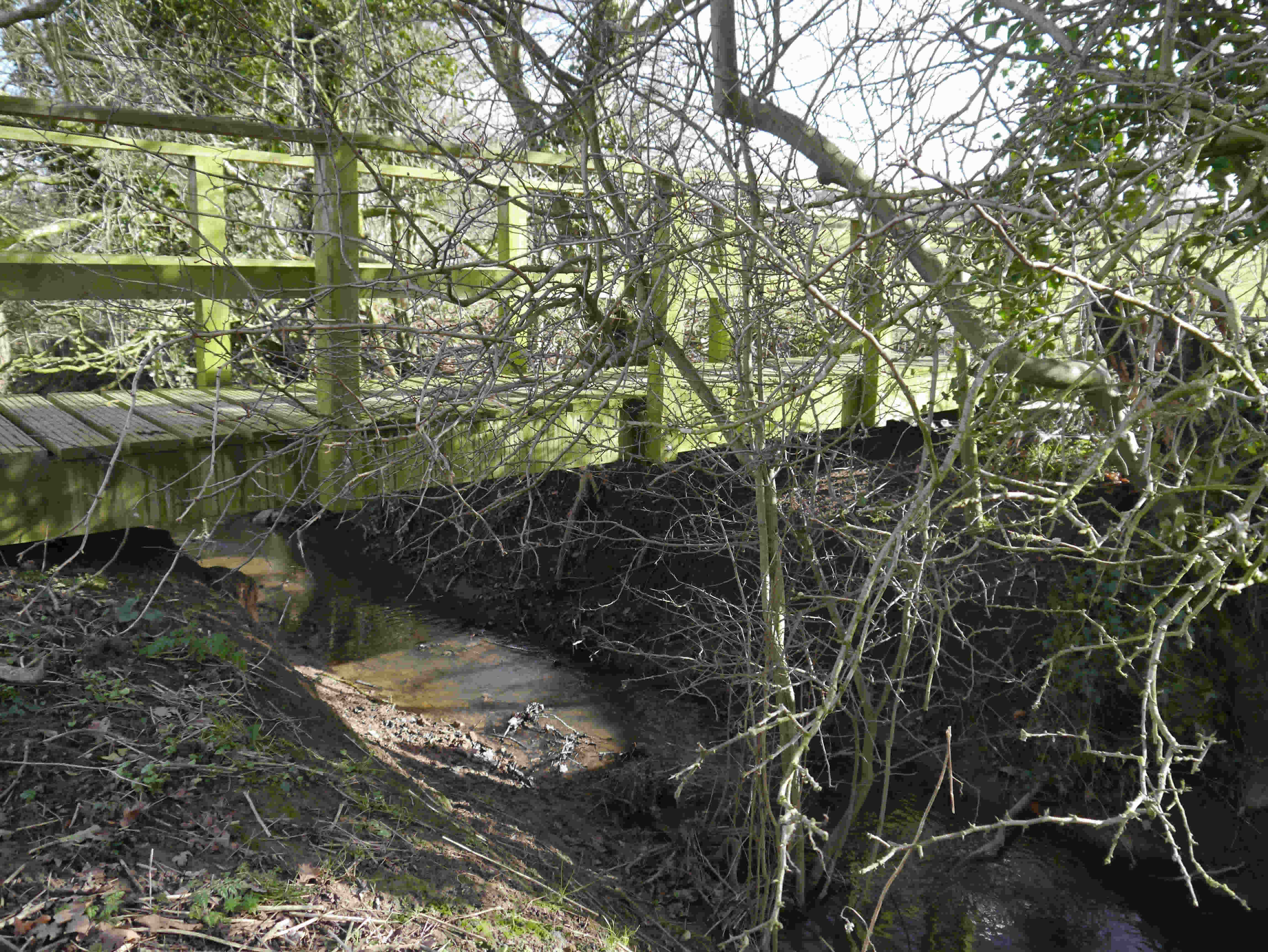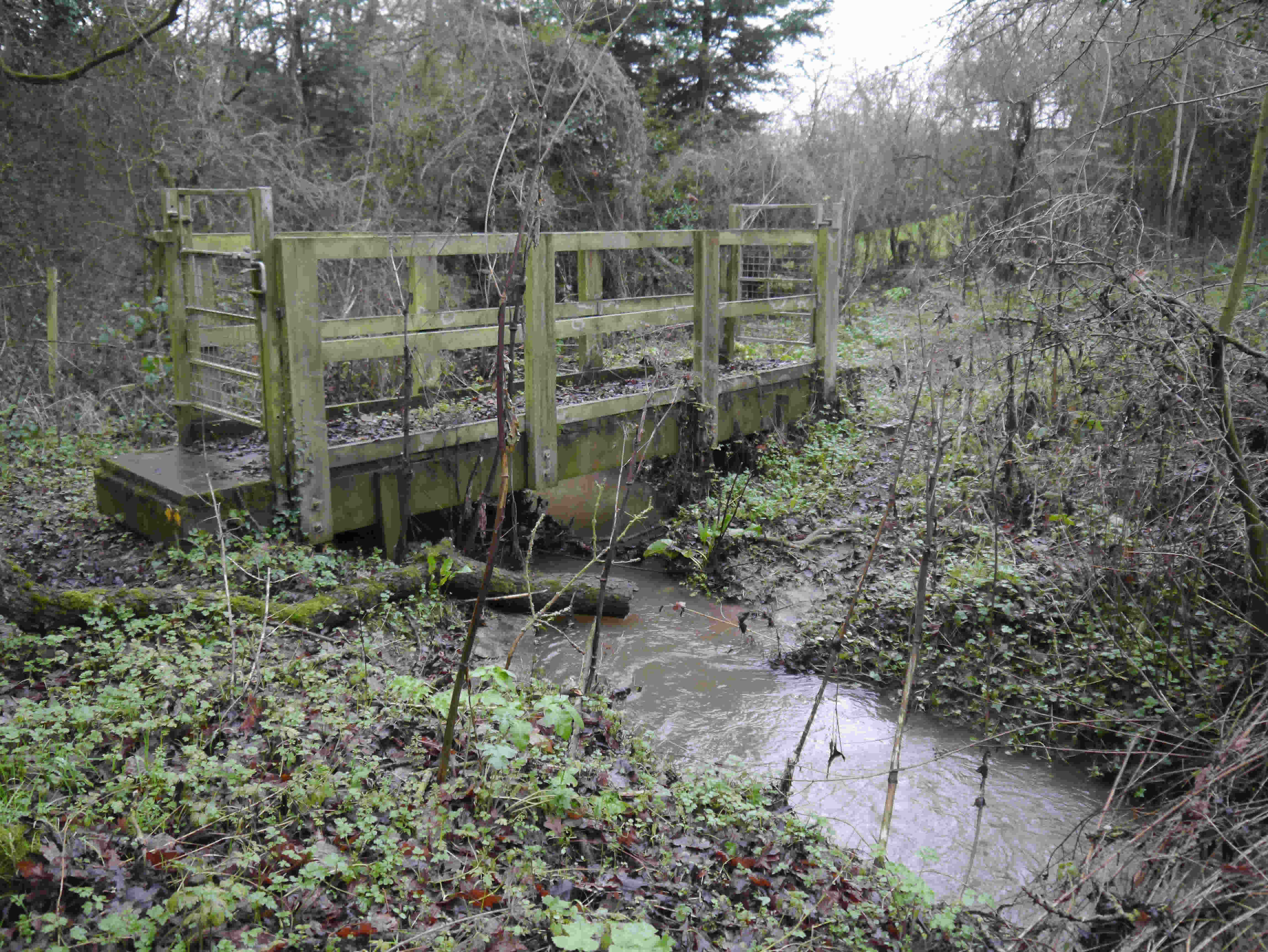 For purposes of this exercise these feeders are called North, Middle and South. Large ponds, on the site of the old brick works, interlink to feed the North feeder that flows via a ditch adjacent to the public footpath along a field boundary. The Middle feeder flows from a pond in a wooded area linked via pipes to ditches on both sides of the bridlepath leading to Dymocks Mill Lane . The South feeder flows from a piped outfall to the North of the public footpath between Greaves Lane and Oldcastle Lane.