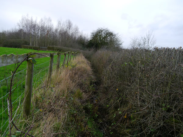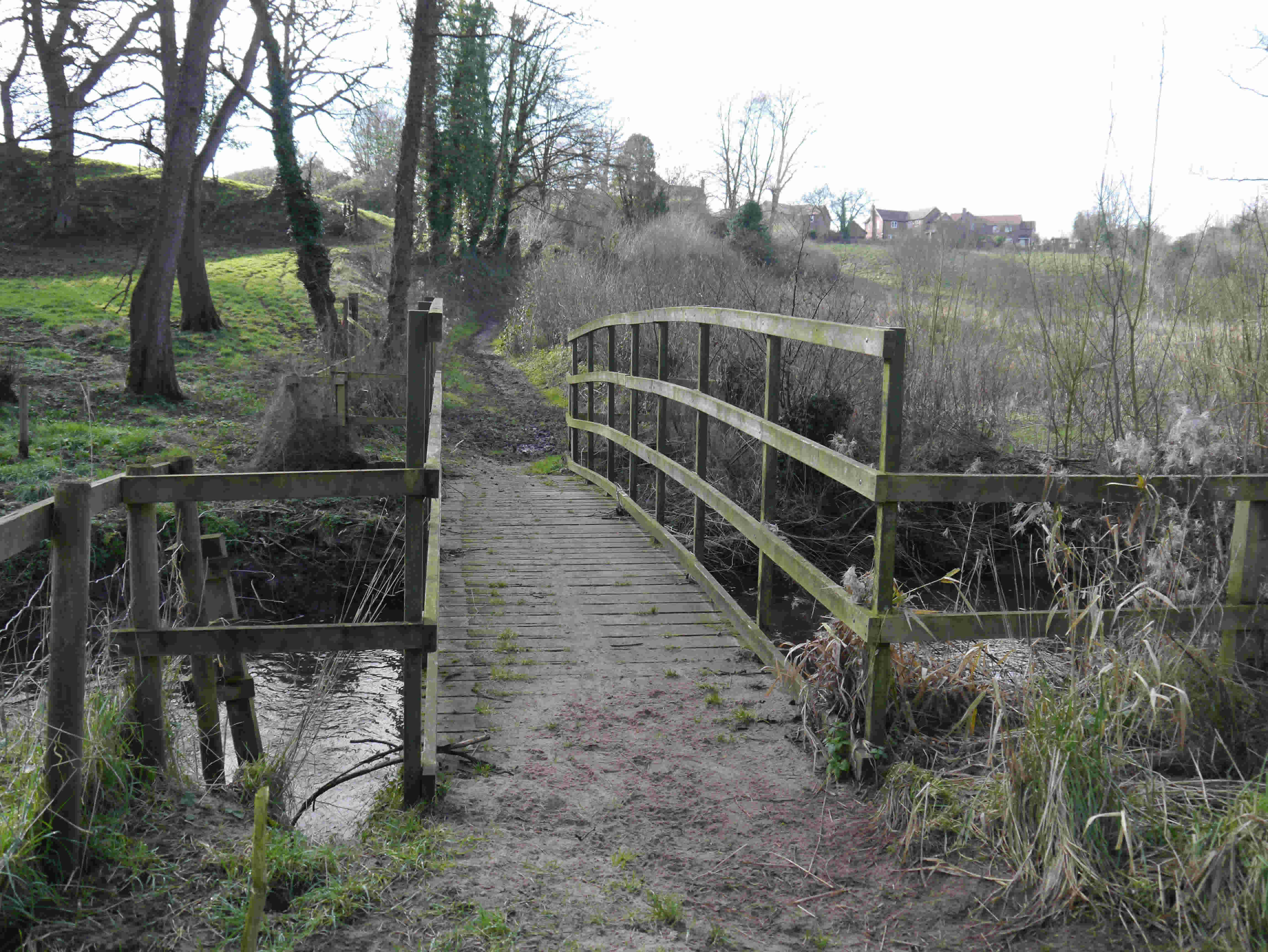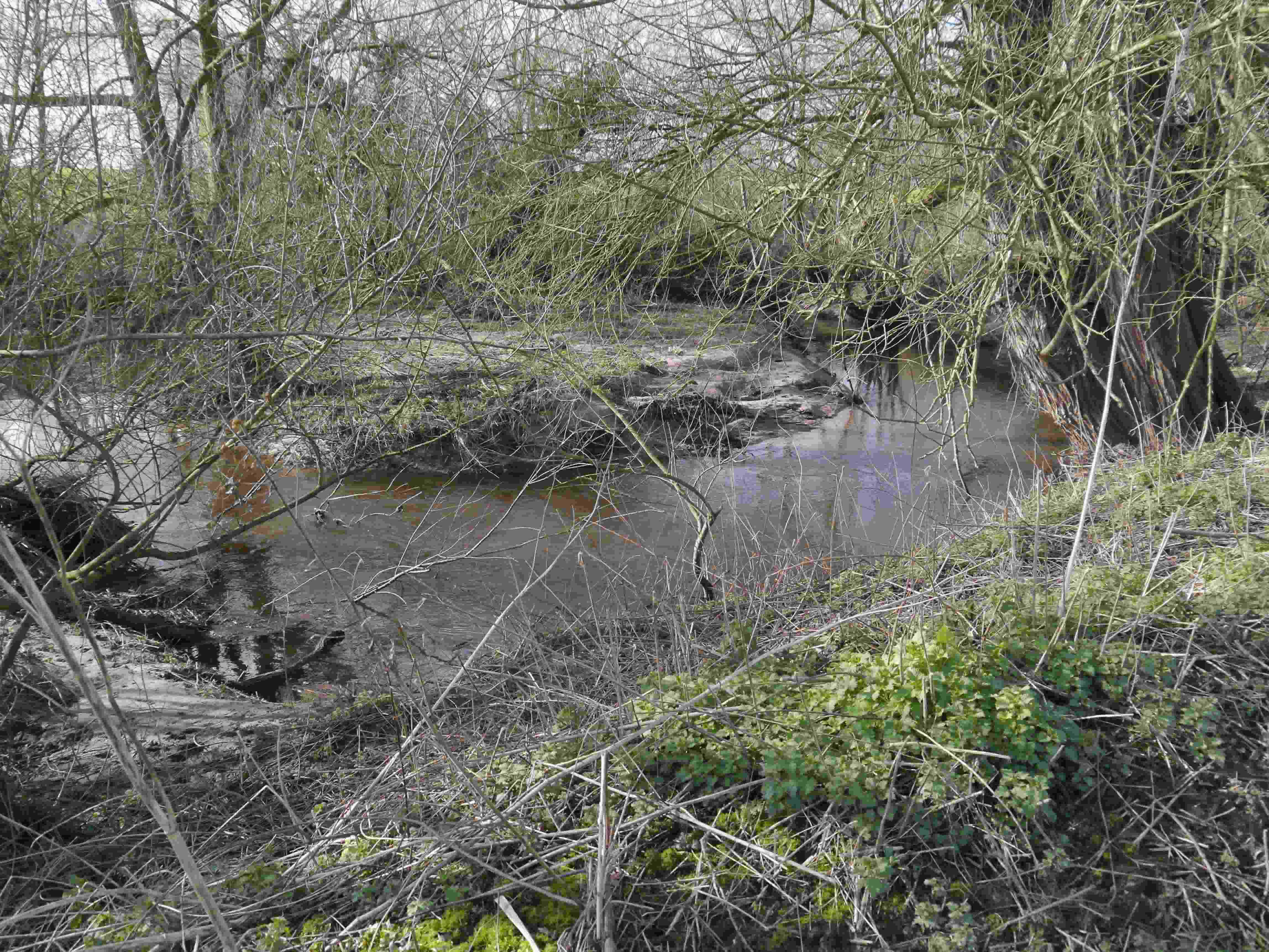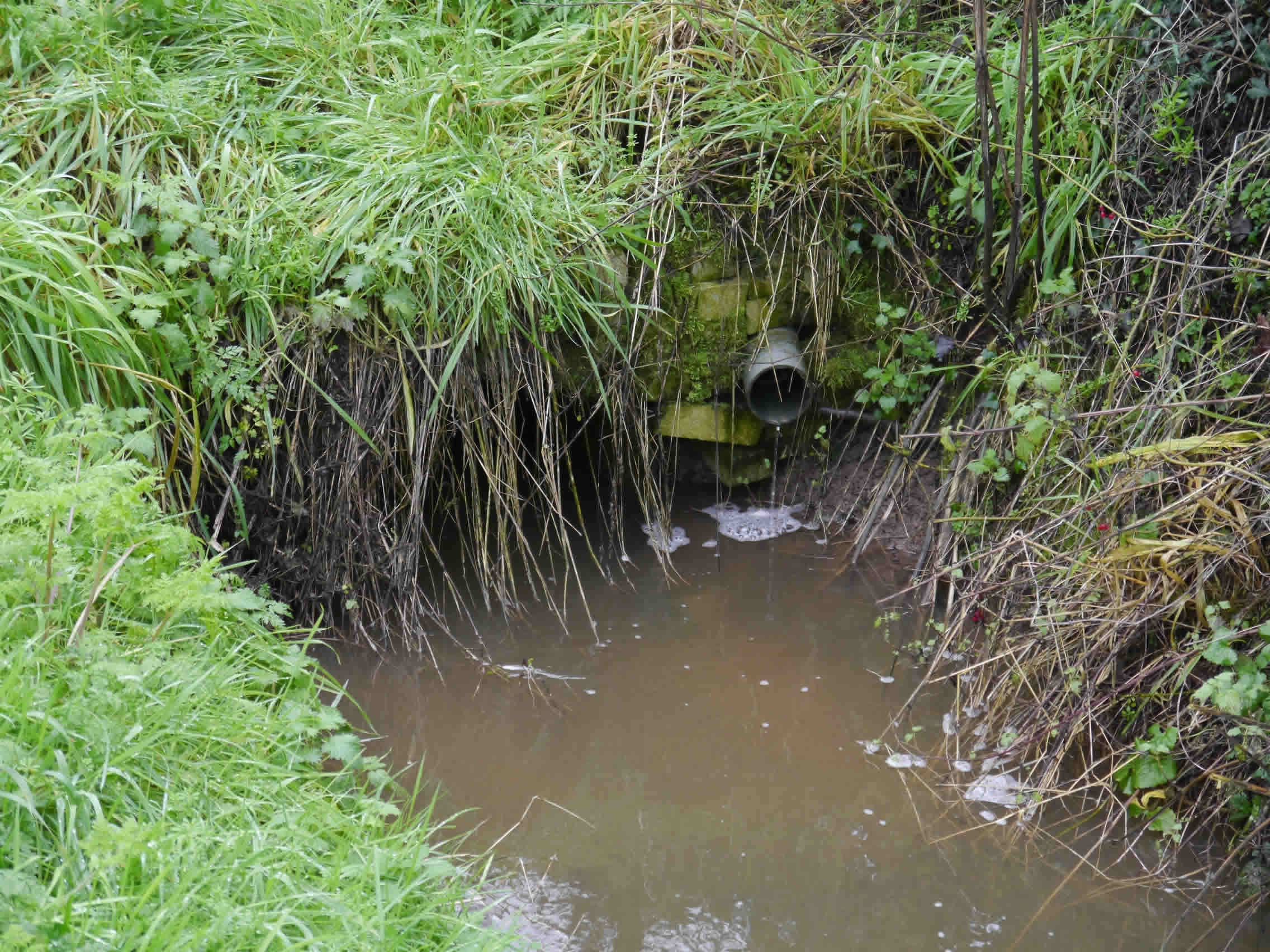 For purposes of this exercise these feeders are called North, Middle and South. Large ponds, on the site of the old brick works, interlink to feed the North feeder that flows via a ditch adjacent to the public footpath along a field boundary. The Middle feeder flows from a pond in a wooded area linked via pipes to ditches on both sides of the bridlepath leading to Dymocks Mill Lane . The South feeder flows from a piped outfall to the North of the public footpath between Greaves Lane and Oldcastle Lane.