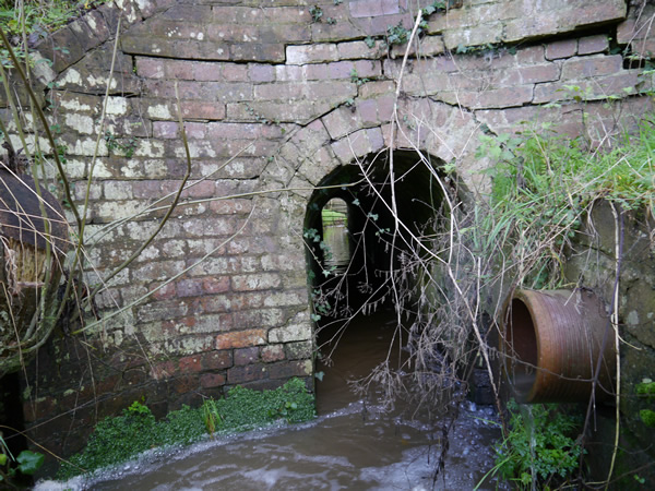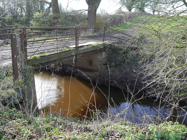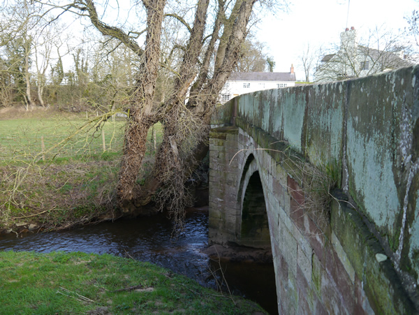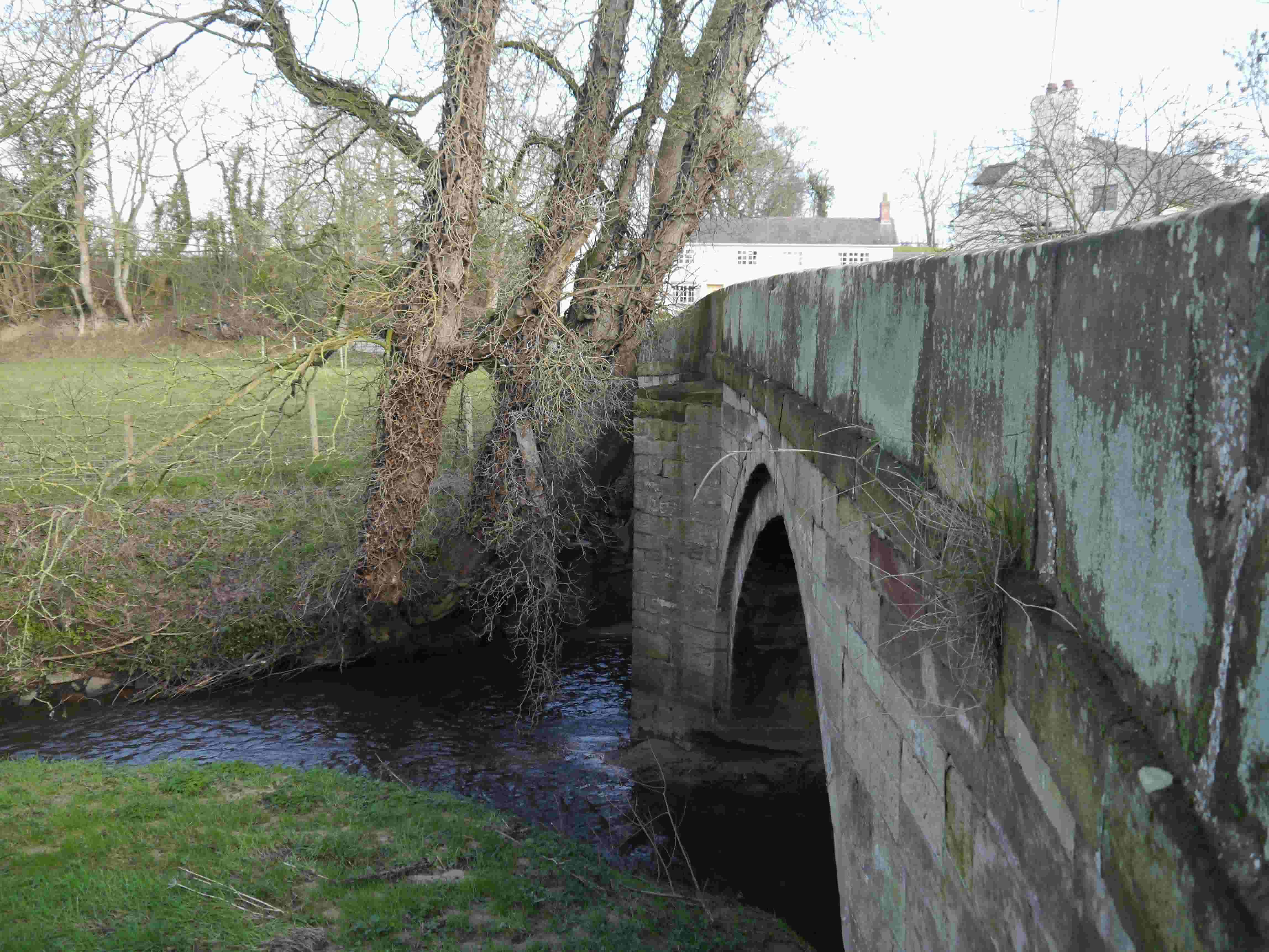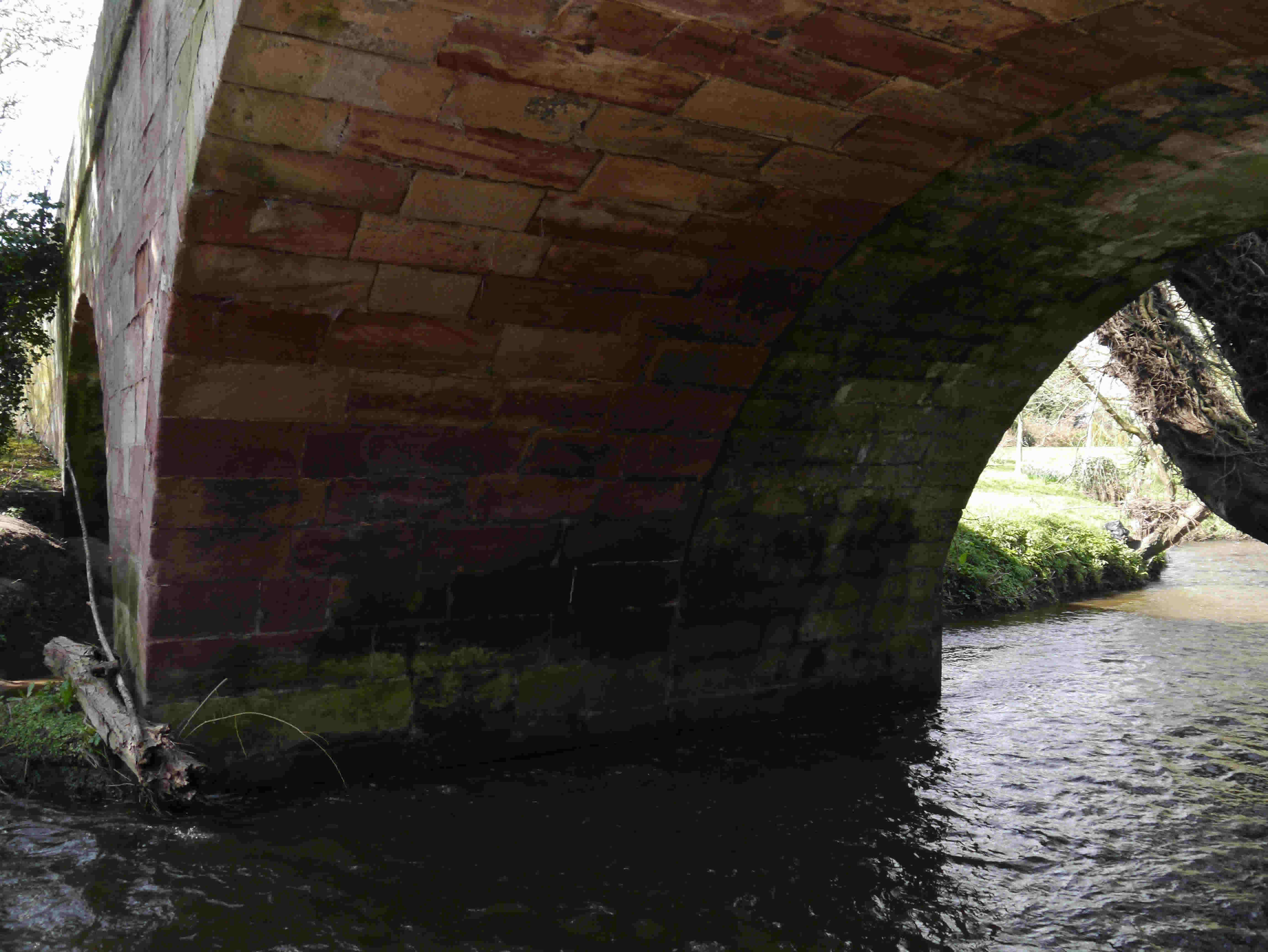 Pic 36 Farm access bridge. The single semi-circular masonry arch bridge appears to date from the early 19th century. Hand carved stone blocks act as arch springers at water level. Handmade bricks, similar to those produced by the Oldcastle Lane brickworks, form the arch barrel and the South spandrel wall. The North spandrel wall and wingwalls have been rebuilt using Ruabon red engineering bricks, possibly during the early 20th century. Substantial capping stones adorn the parapet walls. In its day, this has been an impressive structure and poses the question as to whether it was originally intended for other than agricultural use. The proximity of the original Broughton Estate and the existing bridle path to Worthenbury may hold a clue. |