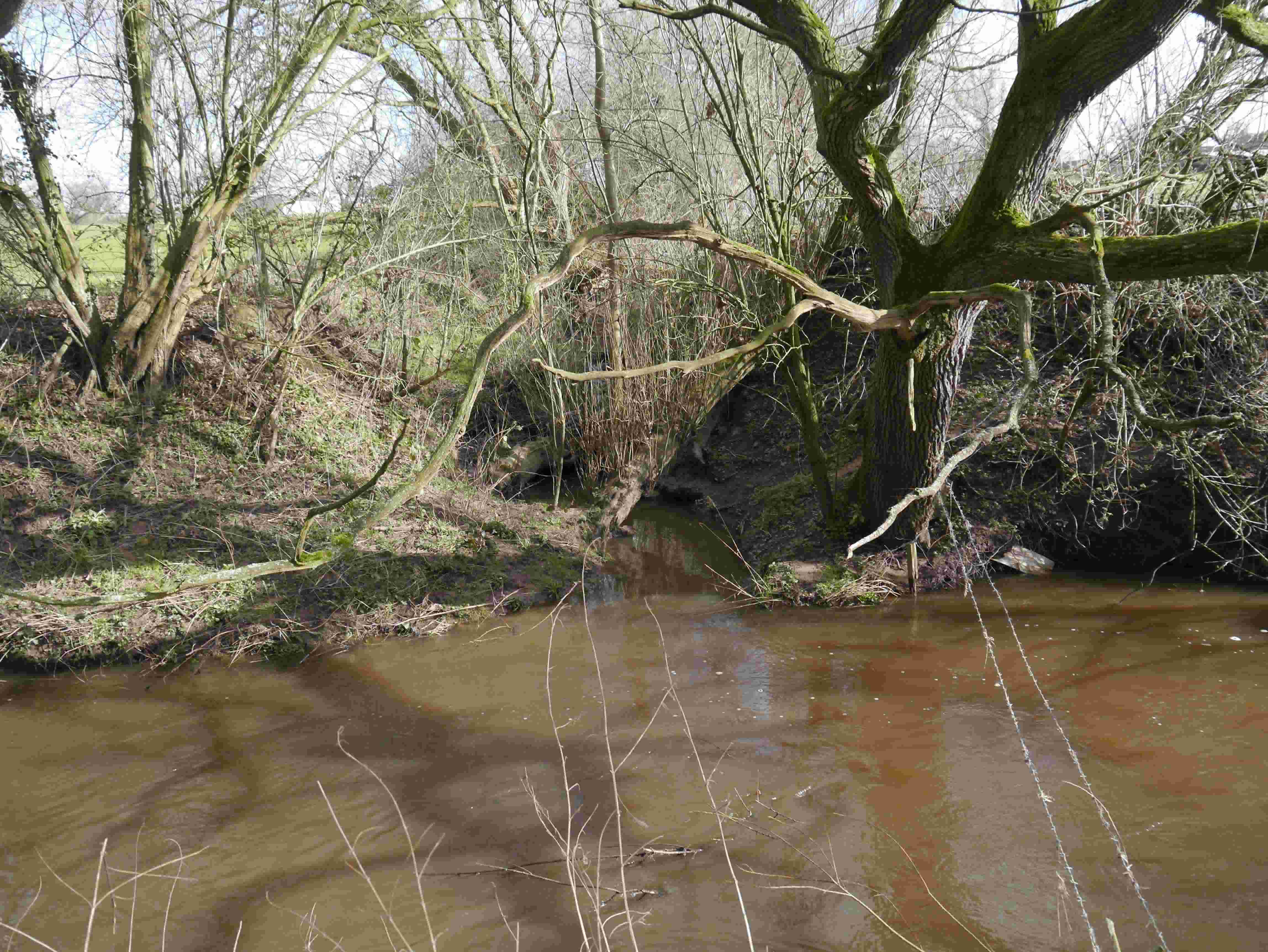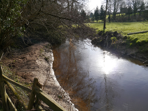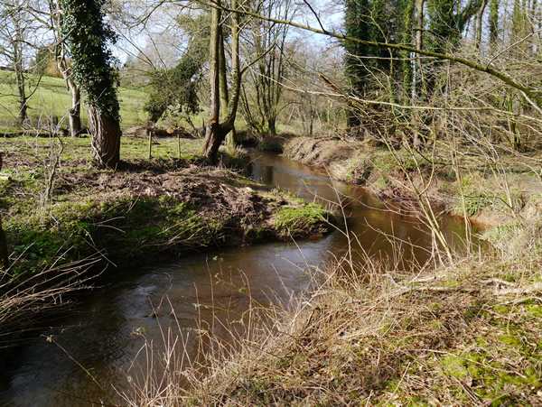 Pic 32 A looping meander with alluvial silt deposited on the inside of the bend. One of several along the Sarn to Caenant Wood section of the brook. |