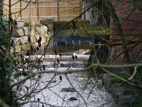 Pic 23 Recent flood protection works at the Mill and Butler’s Yard from Sarn Bridge. Kingfishers can be seen from the Queen’s Head beer garden during the Summer months perched on a rock near the weir, before darting to catch their next meal. They are likely to nest in cavities in the soft banks of the brook. |