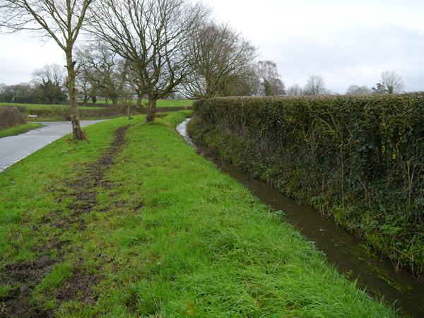 Most of Threapwood’s Northern boundary is defined by Flennen's Brook. This watercourse rises to the East of Dog Lane Farm and runs in a ditch South of Dog Lane before crossing the lane in a piped culvert. A timber footbridge crosses the brook South of Tinkwood. A tributary rising in the fields near Cuddington Hall is piped under Crabtree Lane and Tinkwood Lane and forms a confluence with Flennen’s Brook about 50 metres to the South of the Wrexham Road near The Bank. Flennen’s Brook crosses beneath Wrexham Road in a brick lined culvert before continuing to the Dingle plantation and crossing beneath the road to Shocklach in a recently rebuilt box culvert. Over the 2.2km between Doglane Farm and the Shocklach Road culvert the brook falls at an average gradient of about 1 in 55. The brook subsequently joins Worthenbury Brook near Shocklach Hall en-route to the River Dee.