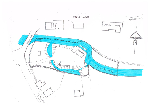 The Sarn Mill was, until the mid 1980s, set on an island formed by Wych Brook to the North and a channel cut to the South. A culvert has since replaced the channel.