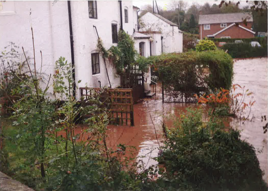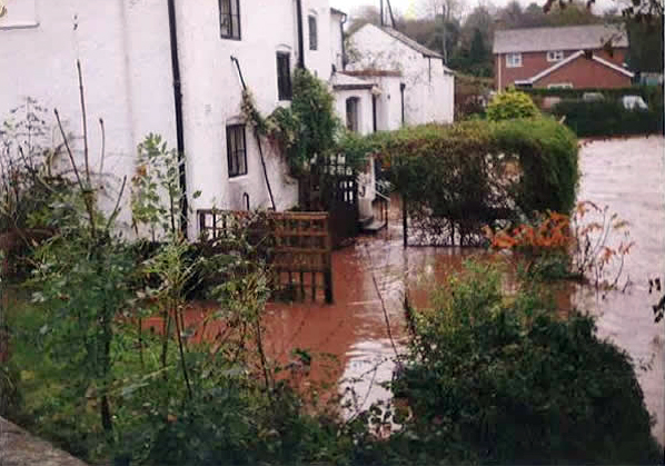 Pic 26 Wych Brook in flood at the Queens Head, Sarn in October 2000. The flood of July 2007 fortunately did not rise to this level. |